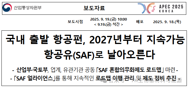 韓國(guó)強(qiáng)制:出境航班使用可持續(xù)航空燃料(SAF),從2027年起